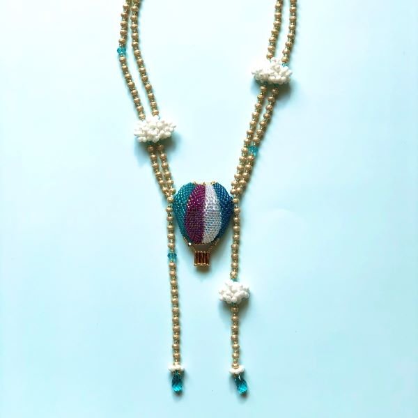 大切な人のもとへ自由に行き来できない今だけど、青空を見上げ、目を閉じて気球に乗ってふわふわと世界中をめぐりましょう。各種シードビーズで気球やもこもこの雲を、編み上げます。