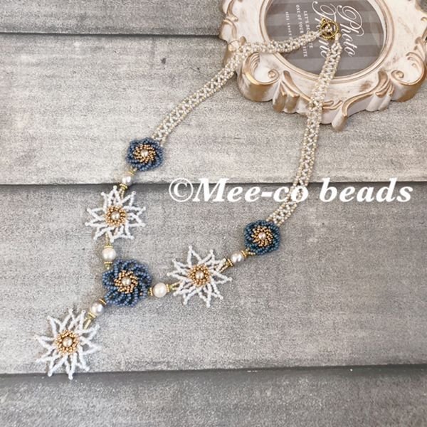 透け感のあるレースのようなフラワーを編み繋げました。首元がすっきり見えるY字のネックレスです。ビーズステッチ経験者であれば、問題なく完成出来ると思います。