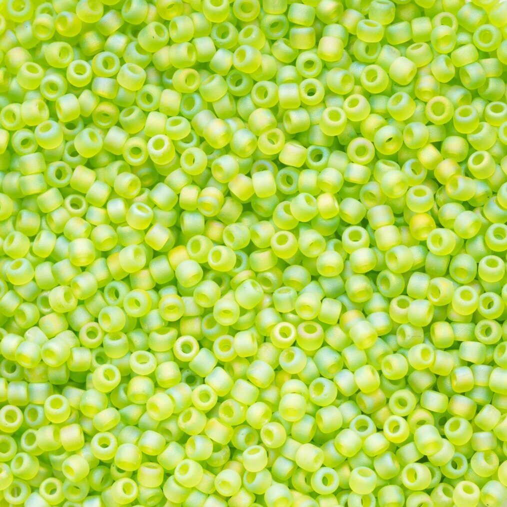 「トランスペアレント フロスト AB」は、透明色のビーズにフロスト(マット)加工とレインボー(AB)加工をしたビーズです。マット加工のためふんわりとしたレインボーの発色で、落ち着いた雰囲気です。