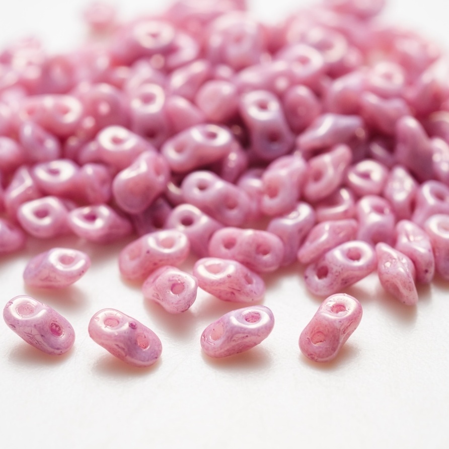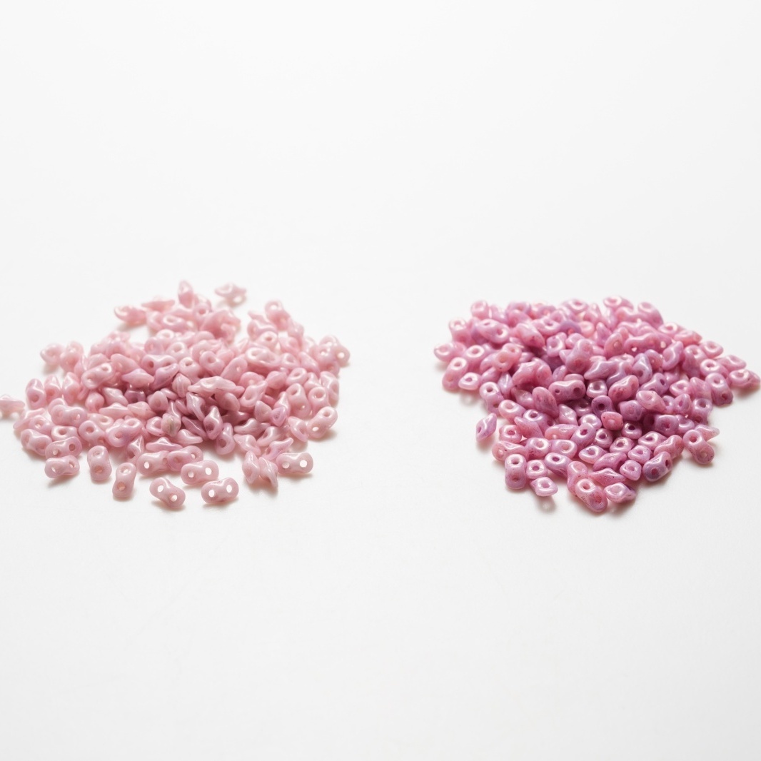 とても小さなスーパーデュオ型の2ホール・ひし形タイプのビーズ。おおむねスーパーデュオと同じ考え方で形を組み合わせることができます。スーパーデュオやツインと少し違うのは、側面に少しくぼみがあり、穴の開いている方から見ると8の字にみえるということ。