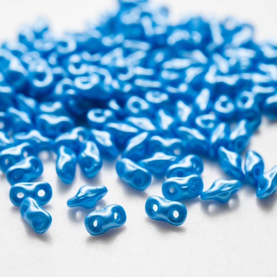 とても小さなスーパーデュオ型の2ホール・ひし形タイプのビーズ。おおむねスーパーデュオと同じ考え方で形を組み合わせることができます。スーパーデュオやツインと少し違うのは、側面に少しくぼみがあり、穴の開いている方から見ると8の字にみえるということ。