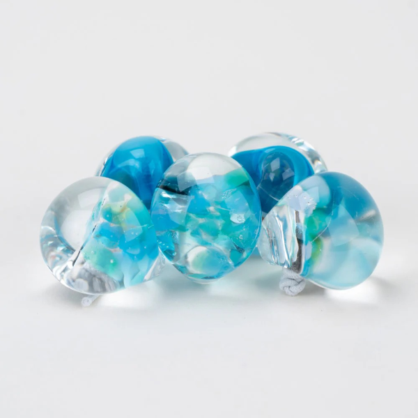 2種のミックスです。水色にクリアガラスの2個と、水色の濃淡をクリアガラスで仕上げた3個。