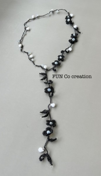 クロッシェで作るシンプルなネックレスとお花のモチーフと葉っぱのネックレスの2種類が編めるキットです。(3枚目画像のように2本制作し、留め具同士をつなげて様々なスタイルで使用できます)