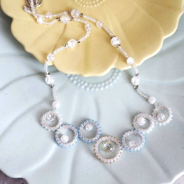 丸を閉じ切る前にクラック水晶を入れるのがポイントです。パーツはペヨーテステッチです。