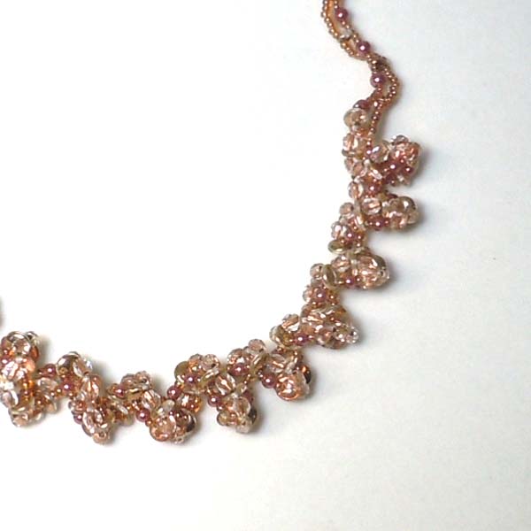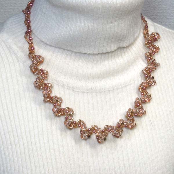 レンティル(2ホール)を使い、スプリング(ばね)のようにクルクル回った編地のネックレスにします。
